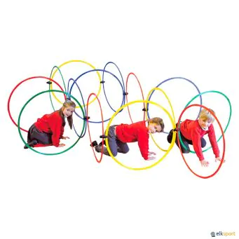 Este innovador conector mantendrá a los niños ocupados durante mucho tiempo creando diferentes configuraciones de laberinto y desplazándose por ellos. Las posibilidades son interminables. Se pueden trabajar muchos aspectos de la motricidad así como desarrollar trabajos en equipo. Compatible solamente con aros planos.